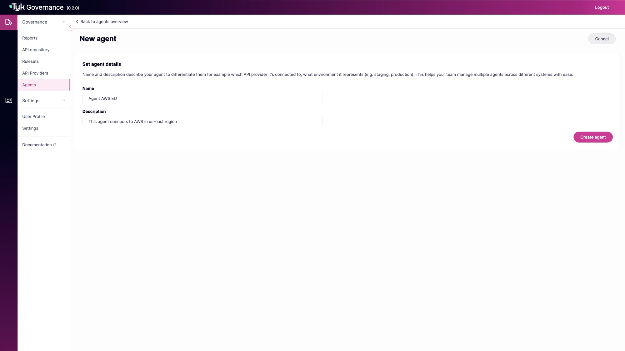 • Description: Details about the agent’s purpose or location (required)