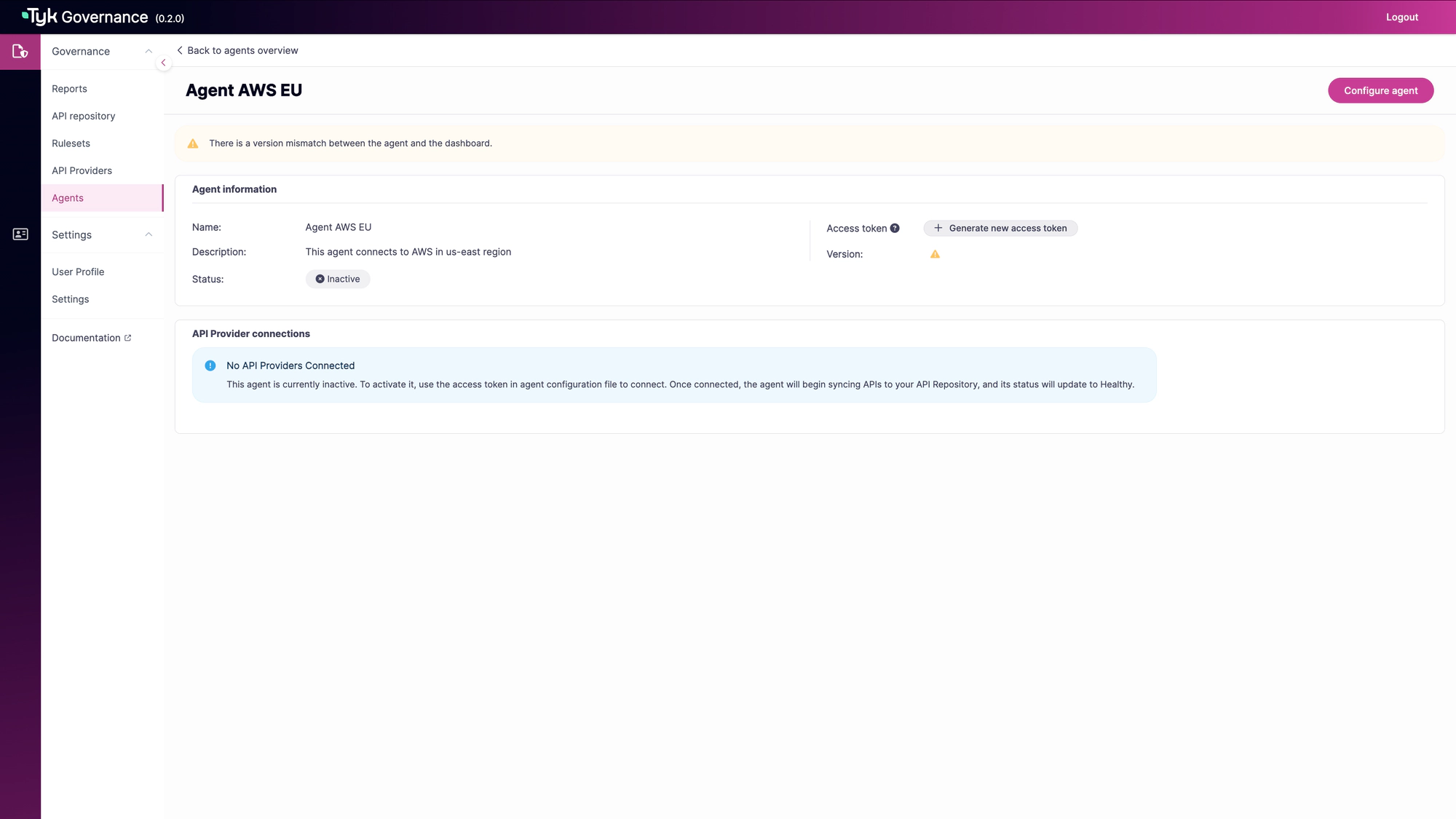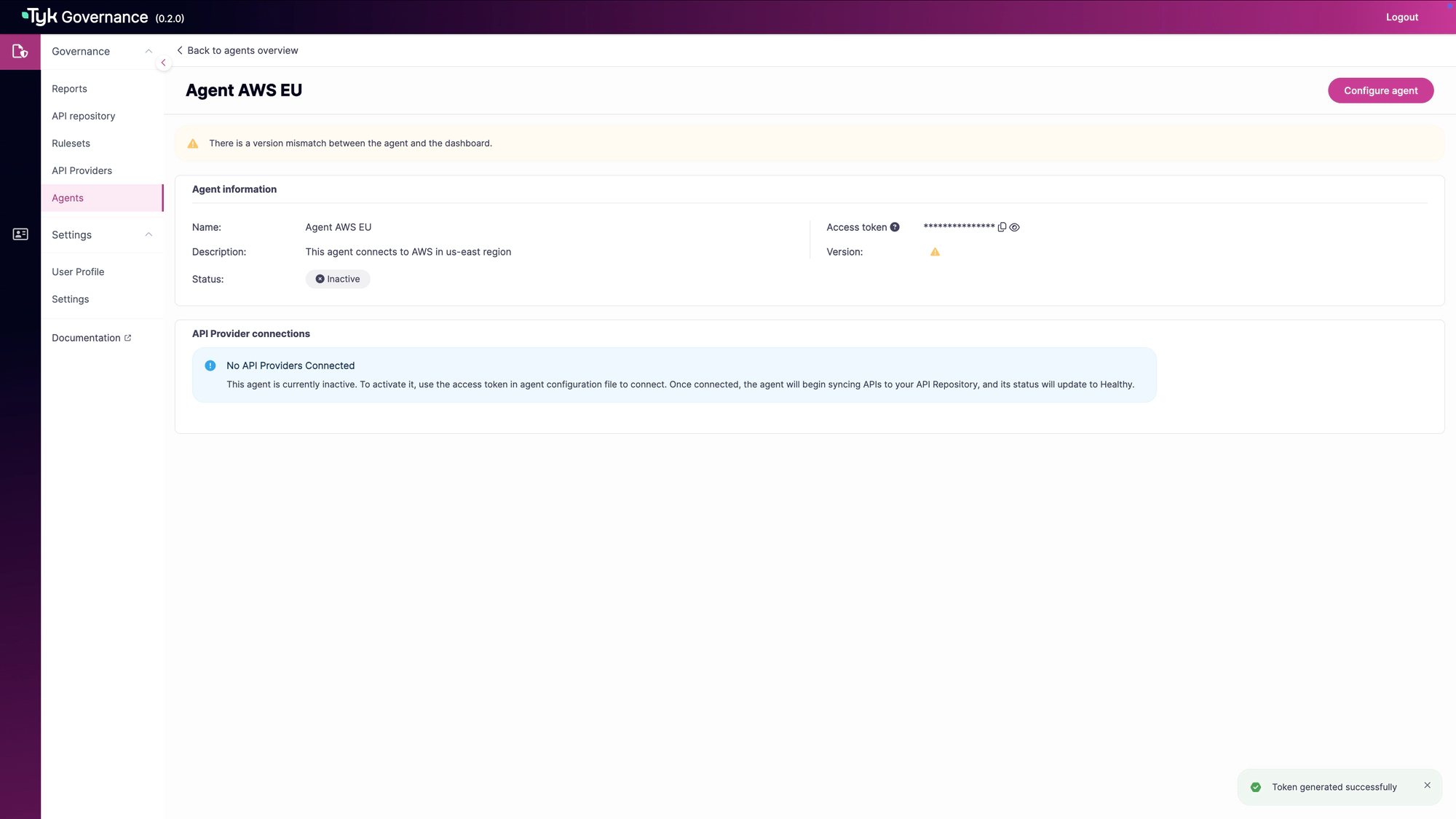 Agent and API Provider Management enables you to deploy, configure, and monitor the Tyk Governance agents that discover and synchronize APIs from various providers.